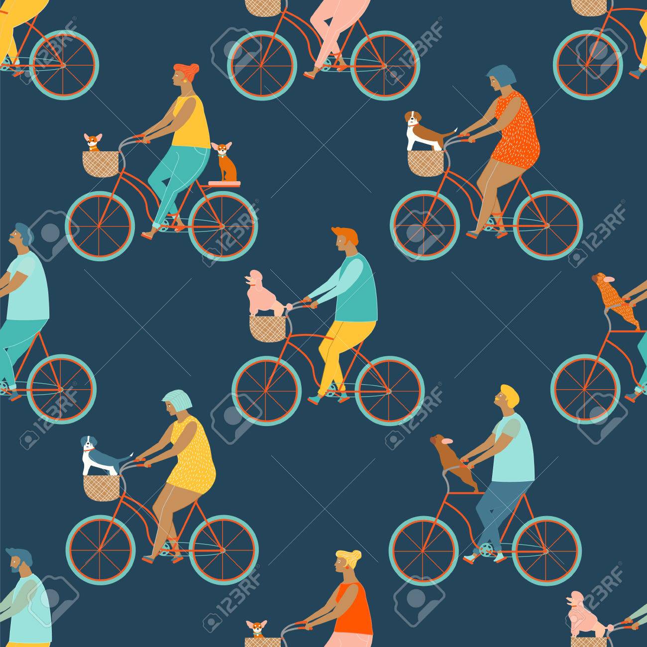 Vettoriale Cavalieri Divertenti Di Bicicletta Del Fumetto Gruppo Senza Soluzione Di Continuita Nel Vettore Amici Del Cane Amici Squadra Equitazione Biciclette Che Trasportano Cani In Cestini Divertenti Attivita All Aperto Di Persone