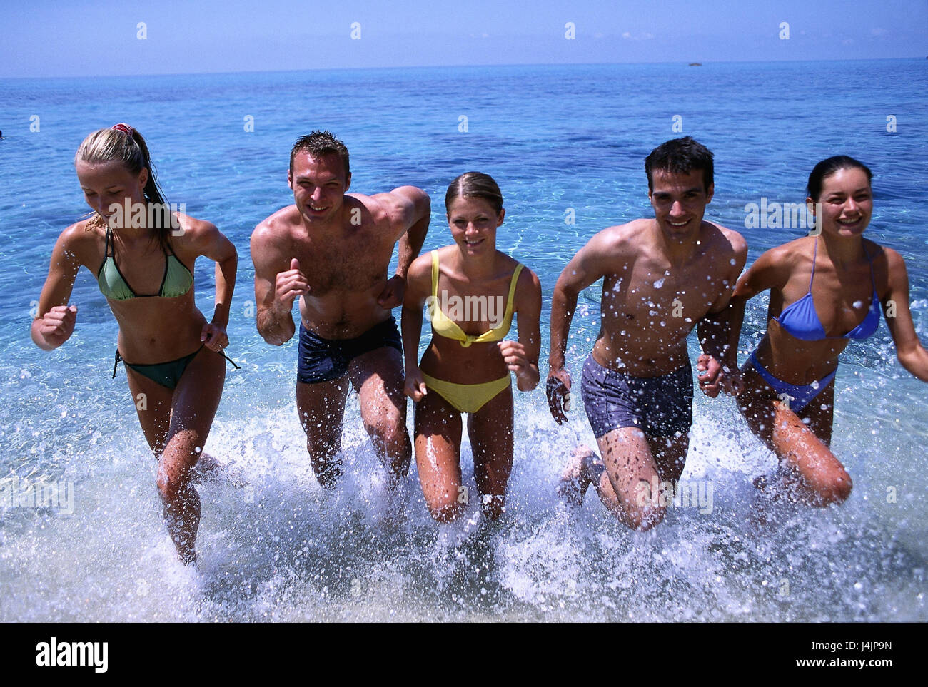 Spiaggia Mare Uomini Donne Esegui Hanno Un Bagno A Fianco A Fianco Al Di Fuori Estate Spiaggia Sabbiosa Acqua Shallowly Vacanze Tempo Libero E Stile Di Vita Costume Da Bagno Amici Felicemente