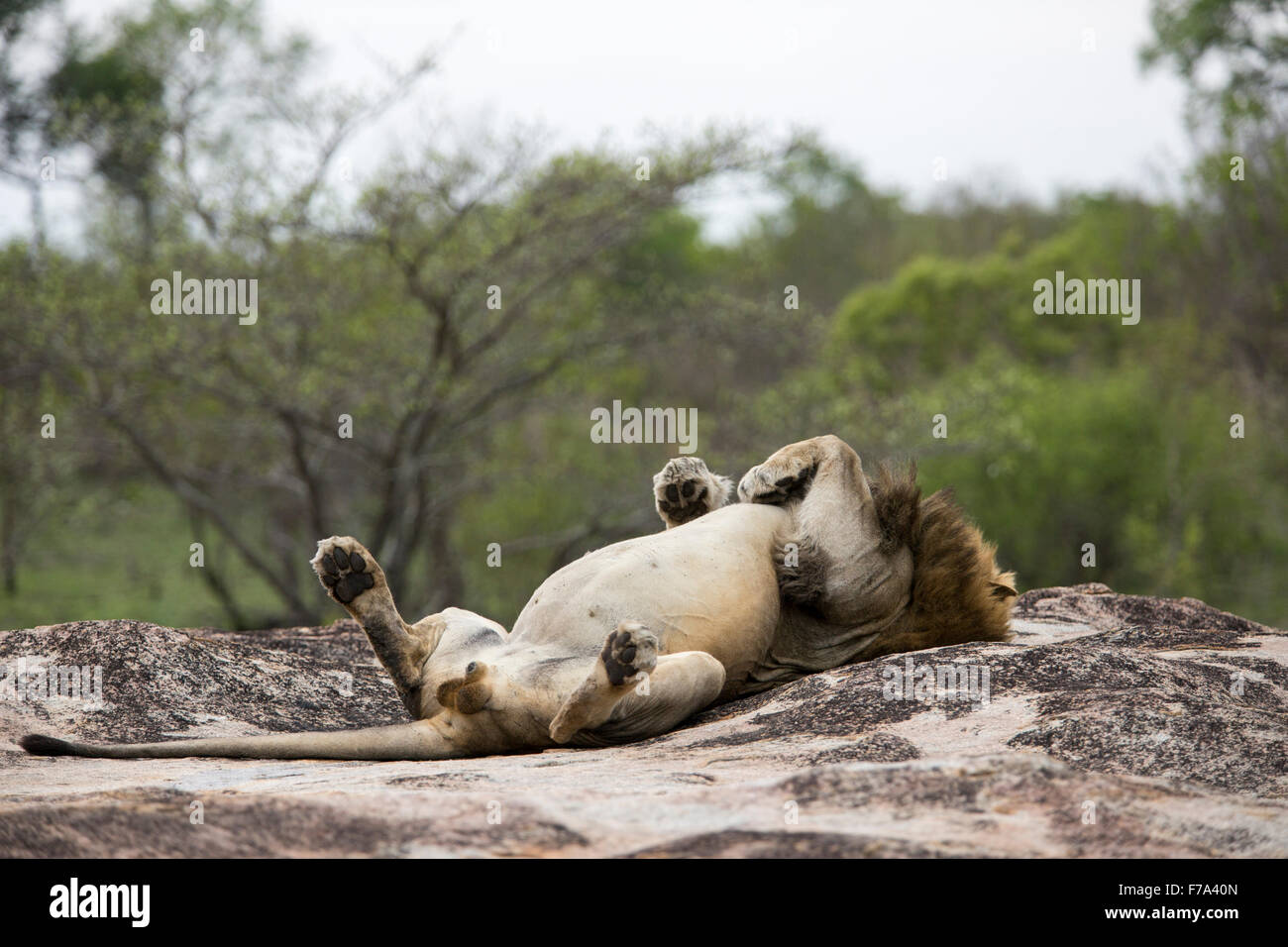 Foto Divertente Di Un Maschio Di Leone In Appoggio Su Una Roccia Con Tutti E Quattro I Piedi In Aria Foto Stock Alamy