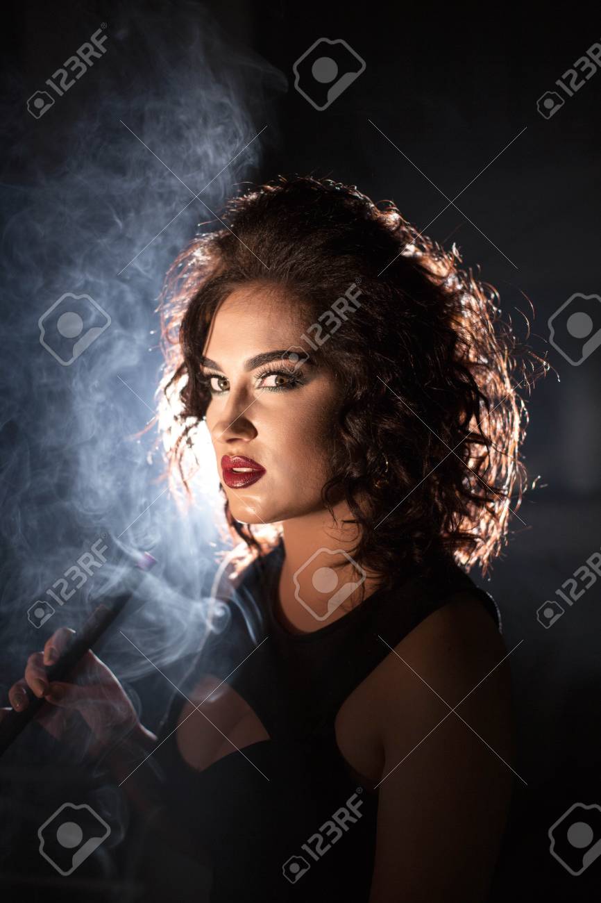 Immagini Stock Ritratto Di Bella Donna Riccia Con Tubo Narghile In Mano Image 85206578