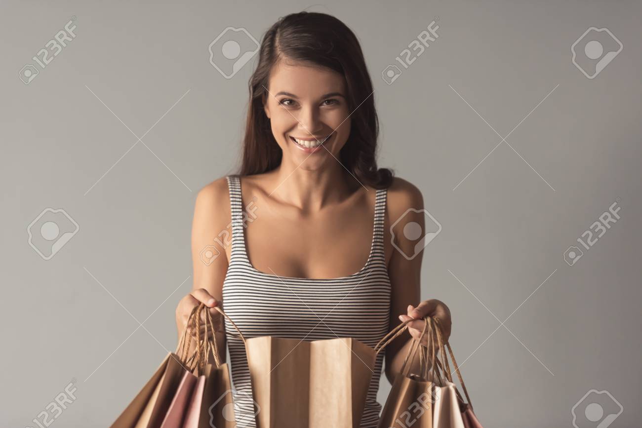 Immagini Stock La Bella Giovane Donna Mora In Vestito A Strisce Sta Tenendo I Sacchetti Della Spesa Sta Esaminando La Macchina Fotografica E Sta Sorridendo Su Fondo Grigio Image 87281662