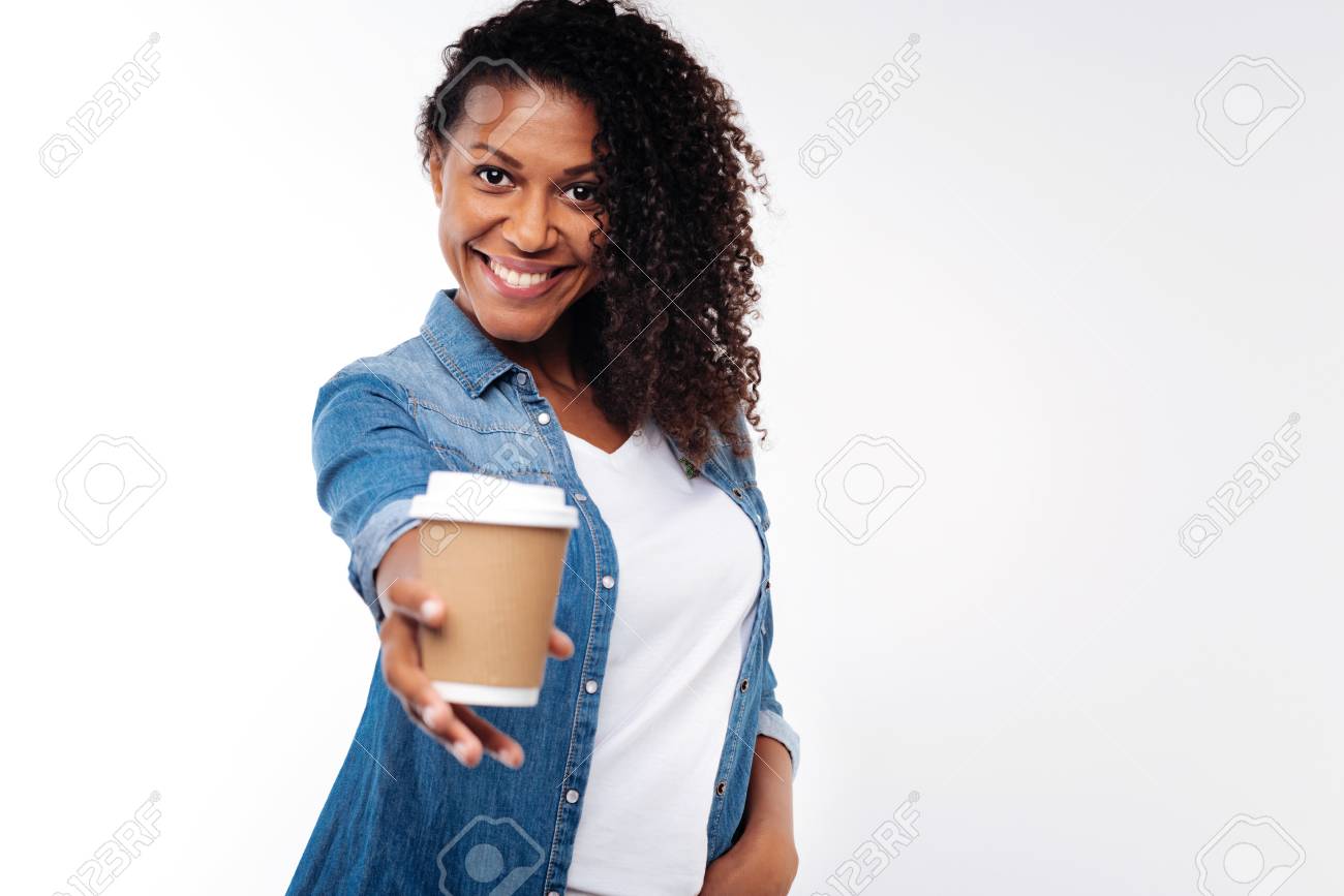 Immagini Stock Donna Mora Che Allunga Fuori Mano Con La Tazza Di Caffe Image 86817562