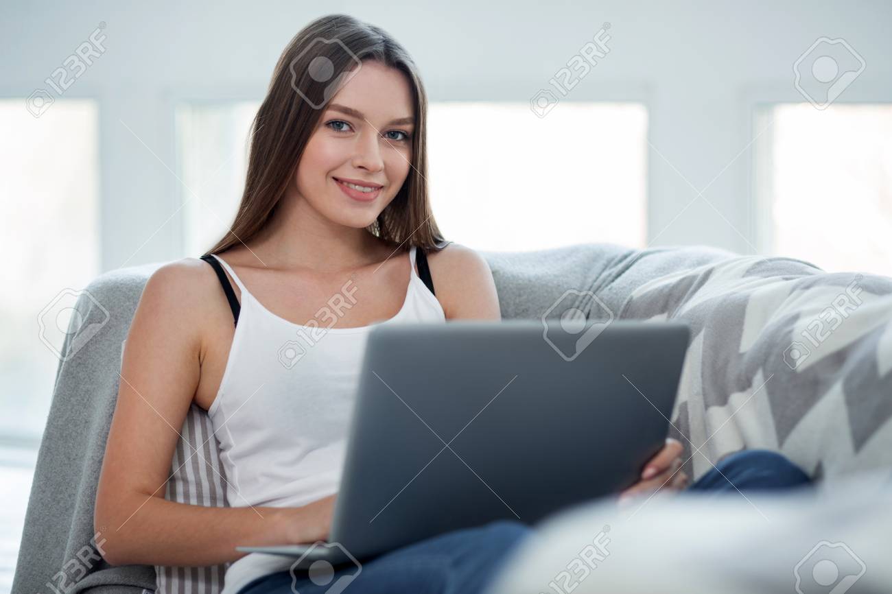 Immagini Stock Lavoro A Distanza Bella Giovane Donna Mora Esuberante Che Sorride E Che Si Siede Sul Sofa E Che Lavora Al Suo Computer Portatile Image 95430265
