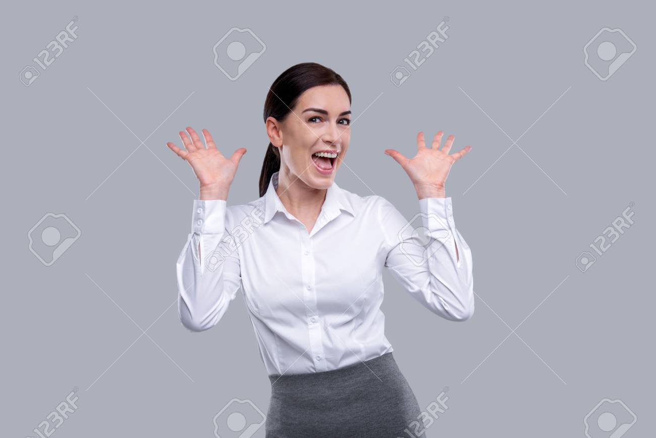 Immagini Stock Cosi Felice Bella Giovane Donna Mora Esuberante Che Sorride E Che Indossa Una Camicia Bianca E Che Tiene Le Sue Braccia In Su E Che Grida Di Felicita Image 96375530