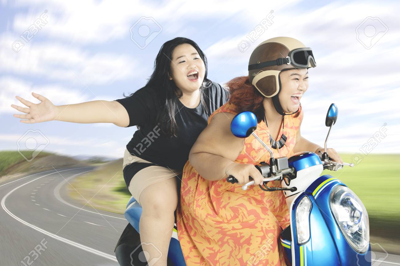 Immagini Stock Due Donne Grasse Che Si Godono Il Viaggio Mentre Guidano Una Moto Ad Alta Velocita Sulla Strada Di Campagna Image 94112332