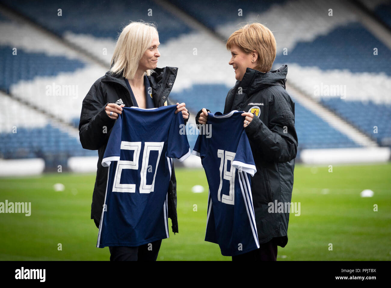 Primo Ministro Nicola Storione Destra Annuncia I Finanziamenti Per Le Donne Scozzesi Della Nazionale Di Calcio Con Allenatore Nazionale Shelley Kerr All Hampden Park Glasgow Foto Stock Alamy