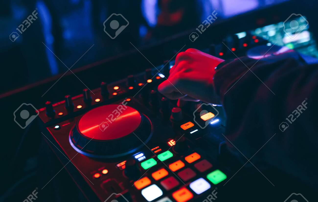 Immagini Stock Producer Dj Mixer In A Nightclub With Glowing Plays Musical Rave Dubstep Electronic Trance Composition With Modern Midi Controller Device In Nightclub Live Musical Production Process For Artists Image 149738268