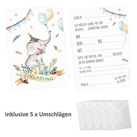 Nikima 5 Biglietti D Invito Per Bambini Motivo Elefante Con Palloncino Indiano Con 5 Buste Trasparenti Eprice