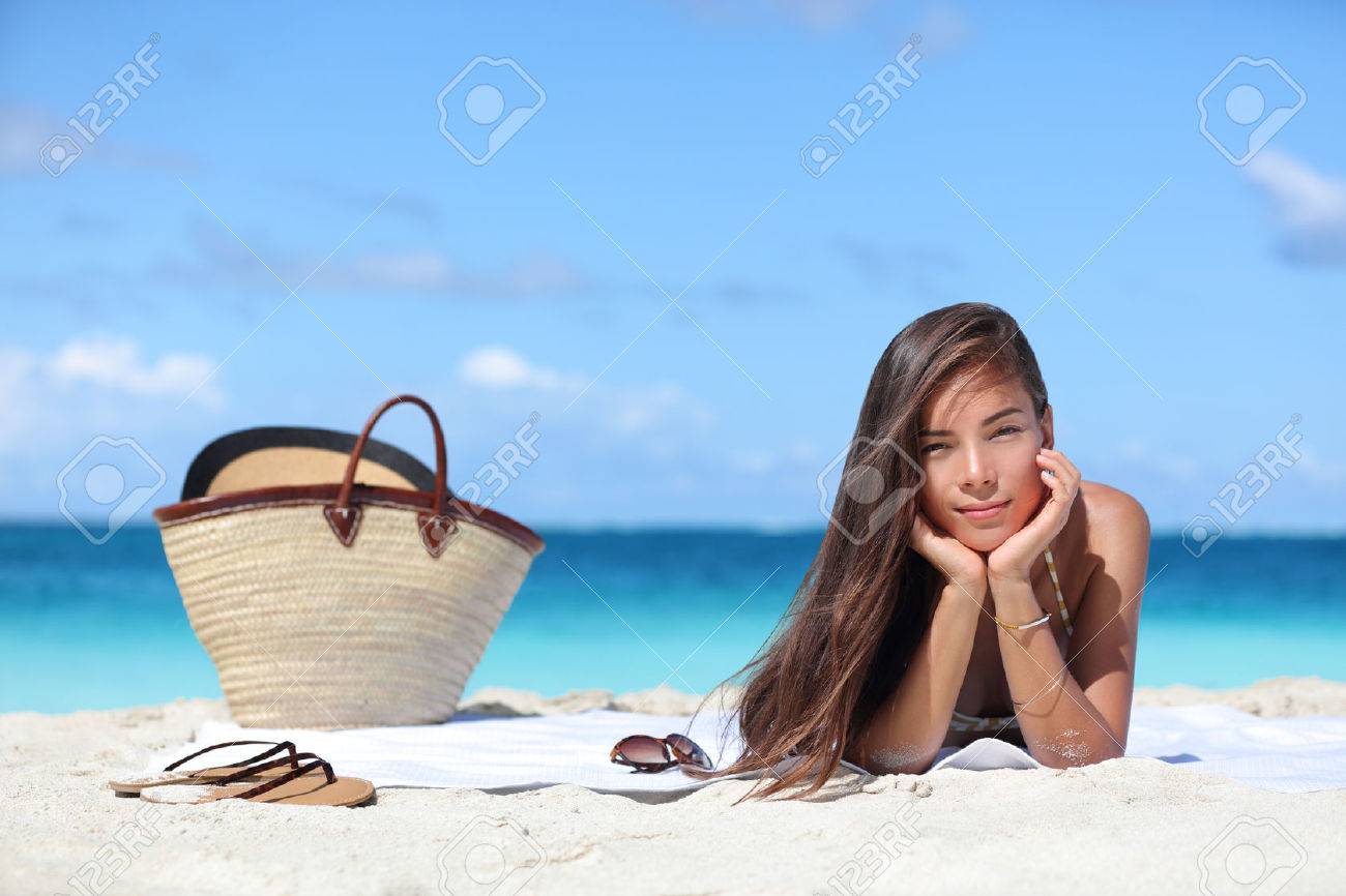 Immagini Stock Donna Che Si Distende Sulla Vacanze Estive Vacanza Al Mare Bella Ragazza Asiatica Che Si Trova Giu Sul Tovagliolo Con Cappello Di Paglia E Ribalta Flops Sulla Concia Sabbia