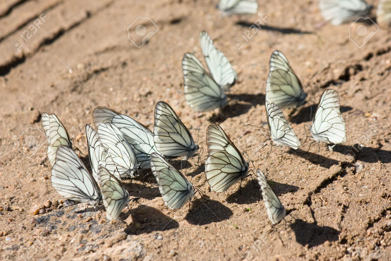 Immagini Stock Molte Farfalle Bianche E Seduto Sulla Sabbia Marrone Sotto La Luce Del Sole Luminoso Image 20611429