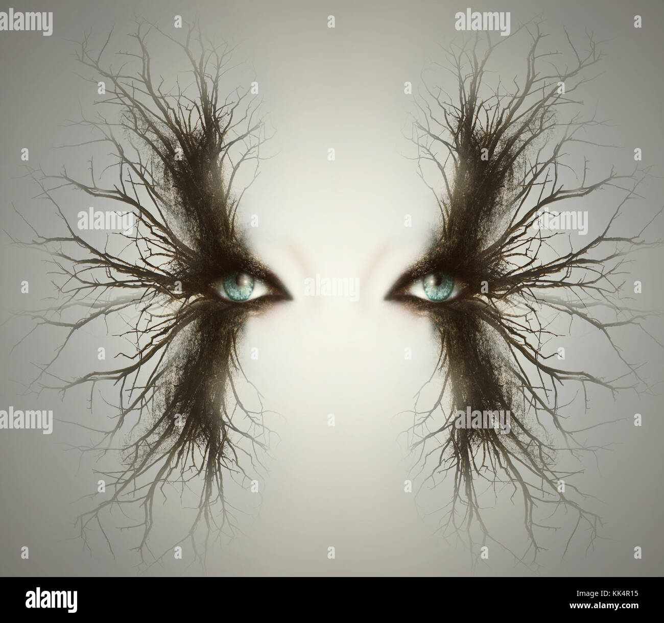 Due Artistiche Occhi Femmina Con Decorazione Di Rami Intorno A Loro Come Fare A Sfondo Grigio Chiaro Foto Stock Alamy
