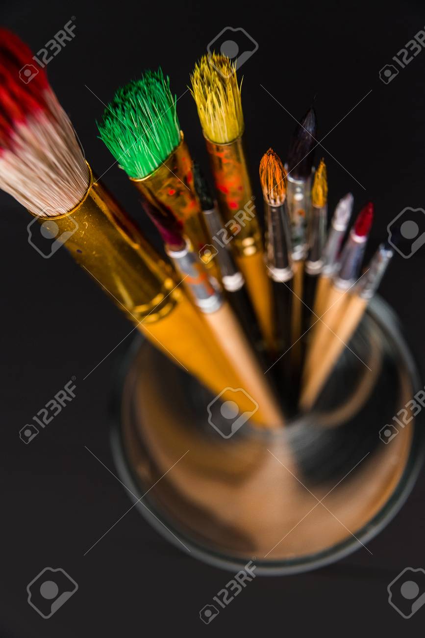 Immagini Stock Spazzole Artistiche Con Tracce Di Vernice Su Uno Sfondo Scuro Con Una Profondita Di Campo Image 85314145