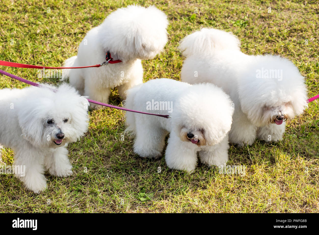 Quattro Cani Bianchi Bichon Frise Si Camminava Nel Parco Visto Da Un Angolo Alto In Close Up Sul Prato Verde Detenute Da Red Guinzagli Foto Stock Alamy