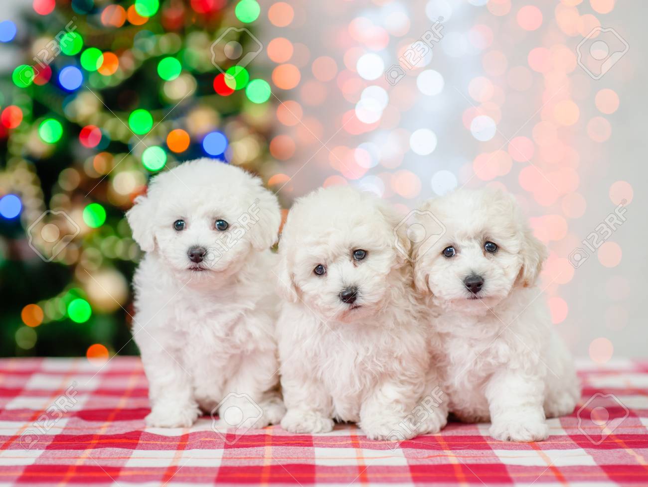 Immagini Stock Gruppo Di Cuccioli Di Un Bichon Frise Su Una Priorita Bassa Dell Albero Di Natale Image 91467746