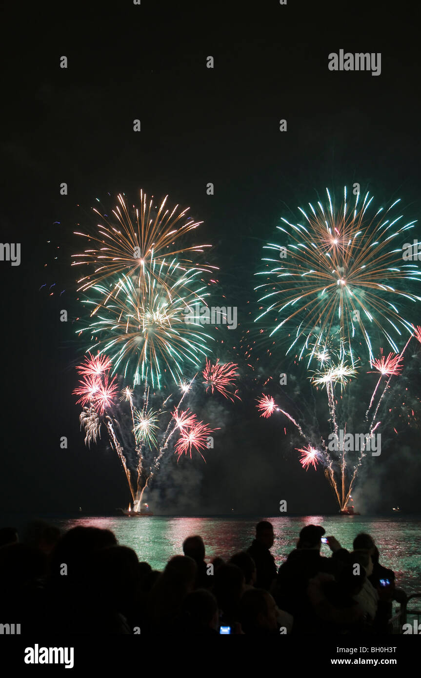 Nizza Francia Persone Che Guardano Il Carnevale Fuochi D Artificio Sul Mare Mediterraneo Foto Stock Alamy
