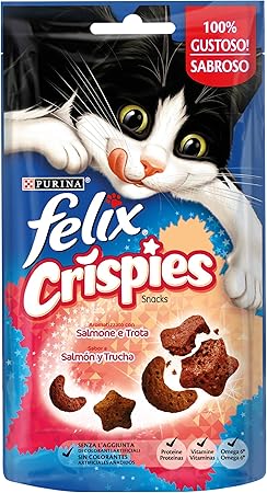 Purina Felix Crispies Snack Gatto Aromatizzati Con Salmone E Trota 8 Confezioni Da 45 G Ciascuna Amazon It Casa E Cucina