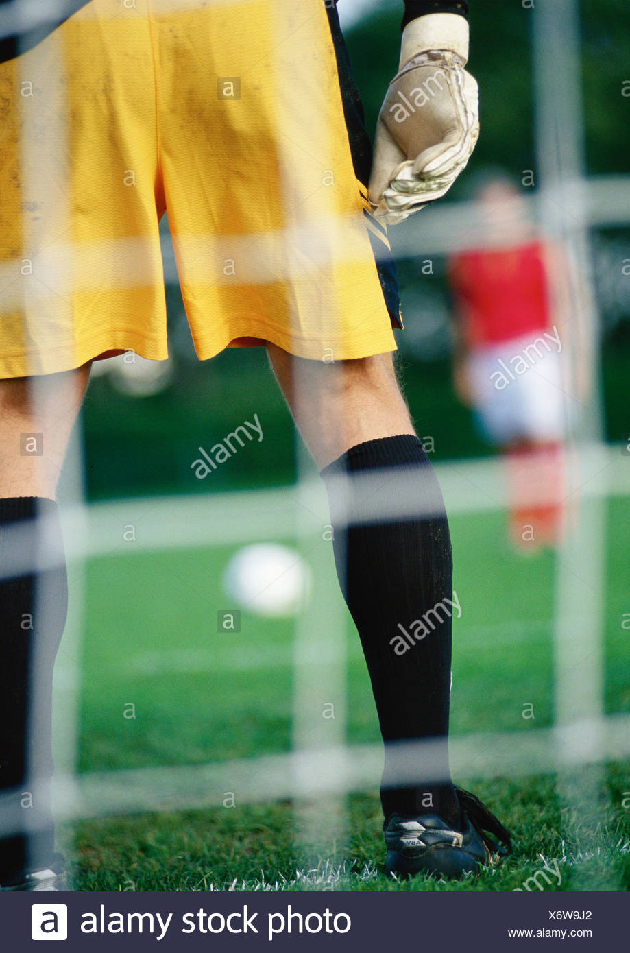 Goal Keeper Defending Goal Area When Opponent Is About To Take Penalty Kick Seen From Behind The Goal Stock Photo Alamy