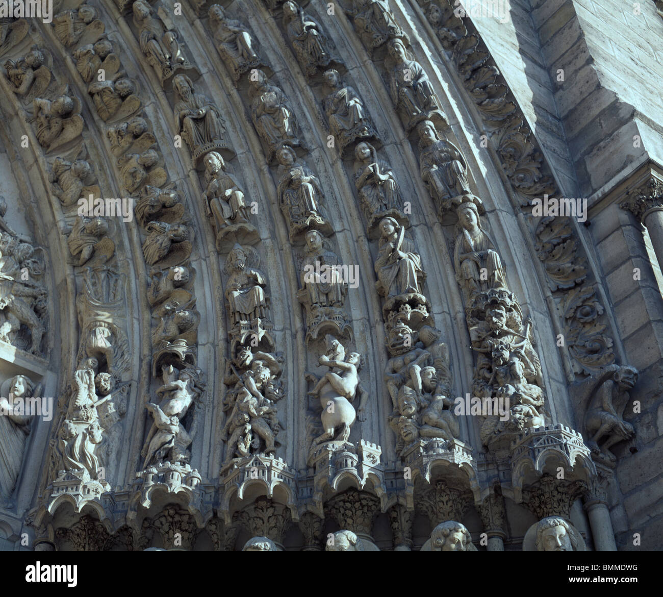 La Cattedrale Di Notre Dame Di Parigi Francia Sculture Di Angeli Santi E Delle Bestie Sul Portale Centrale Fronte Ovest Del Francese Cattedrale Gotica Foto Stock Alamy