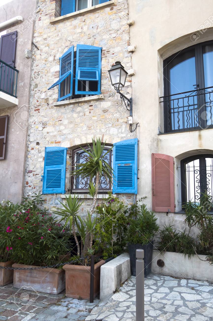 Immagini Stock Il Muro Di Mattoni Di Un Edificio Residenziale A Piu Piani Con Persiane Blu E Grate In Ferro Battuto Sulle Piante Delle Finestre In Vaso Sulla Strada Nella Parte