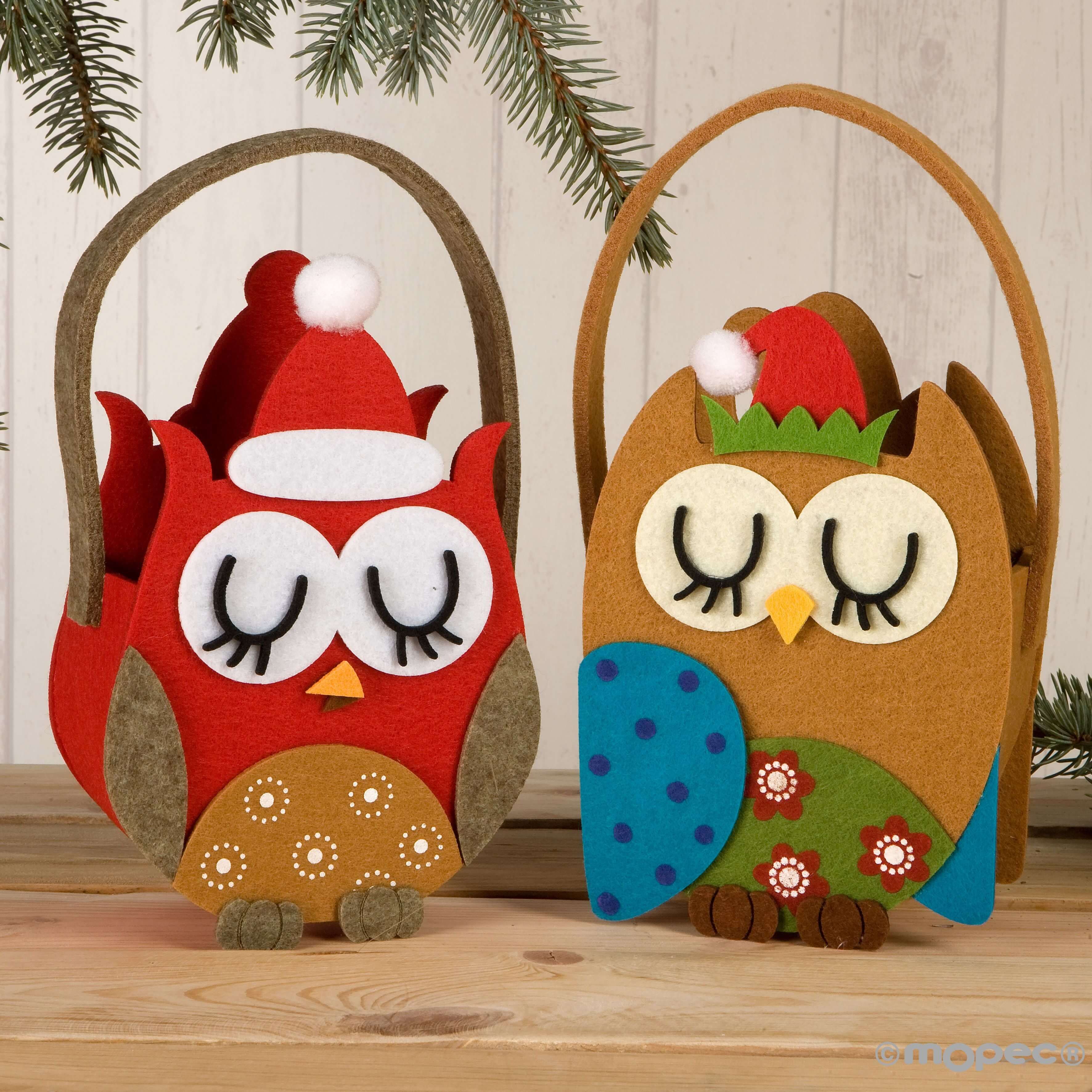Cestino In Feltro Con Decori Gufi Natalizi