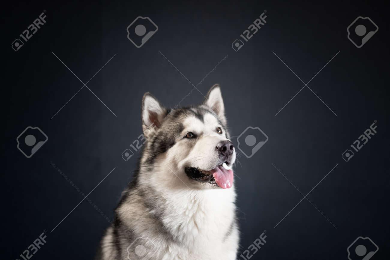 Immagini Stock Husky Malamute Dog On A Black Background Looks To The Right Image 145902003