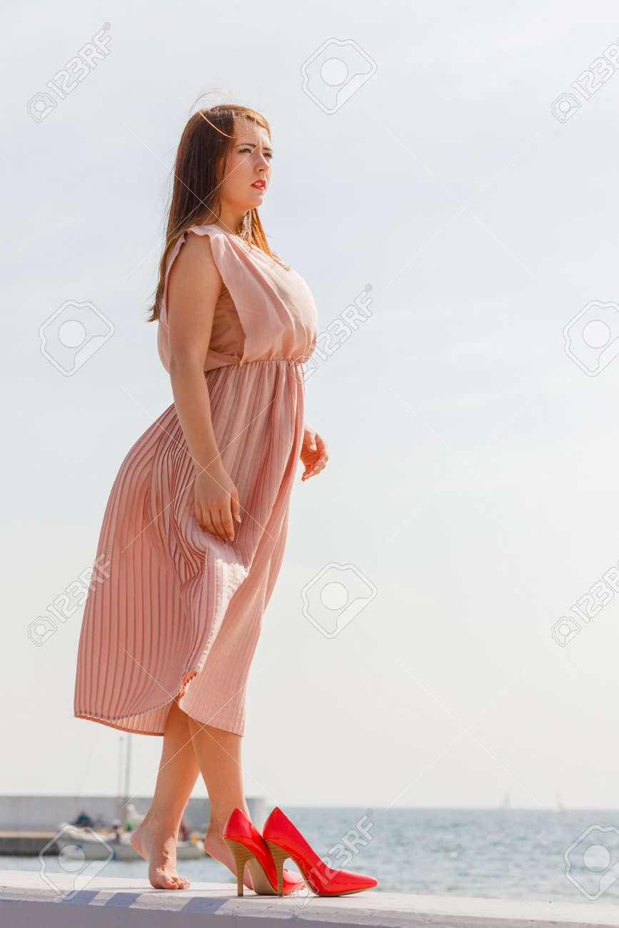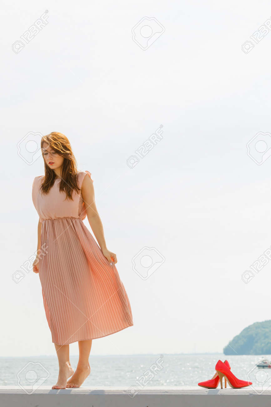 Immagini Stock Hobby Aspetti Idilliache Del Concetto Di Femminilita Donna Che Cammina Sul Molo Senza Scarpe Che Indossano Bellissimo Vestito Rosa Lungo Luce Image 81043613
