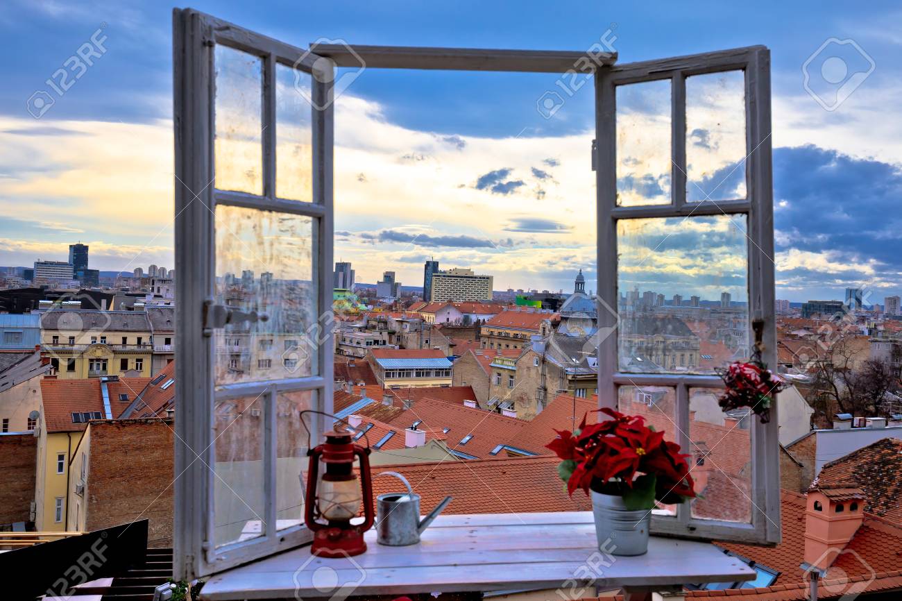 Immagini Stock Idilliache Decorazioni Della Citta Natale Di Zagabria Nella Citta Alta Vista Attraverso La Finestra Sui Tetti Della Citta Capitale Della Croazia Image 92389603