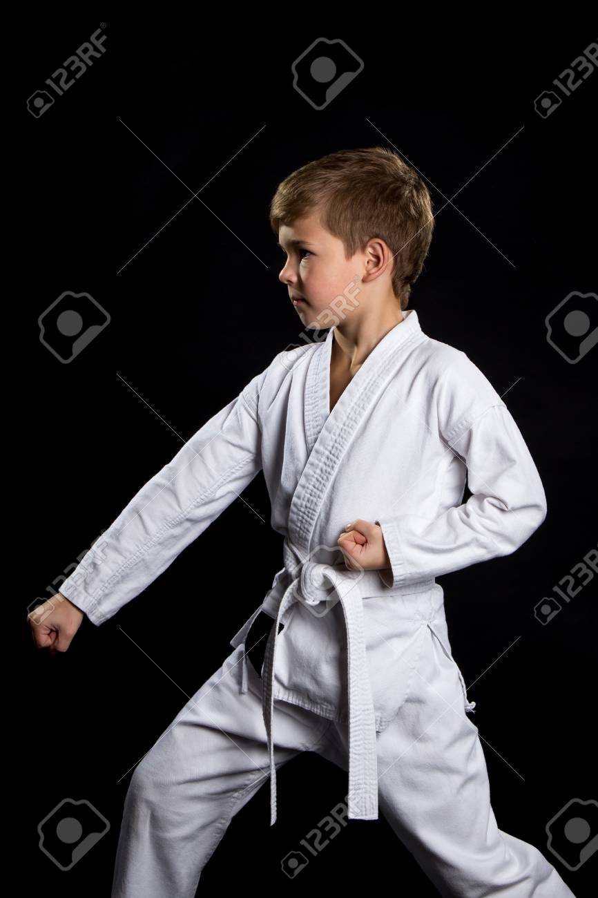 Immagini Stock Colpisci Il Pugno Posa Nel Karate Kid In Kimono Su Sfondo Nero Image 90711246