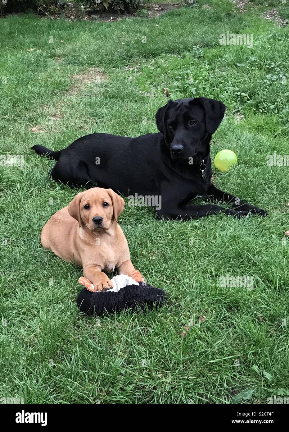 Red Labrador Cucciolo Con Vecchi Labrador Nero Foto Stock Alamy