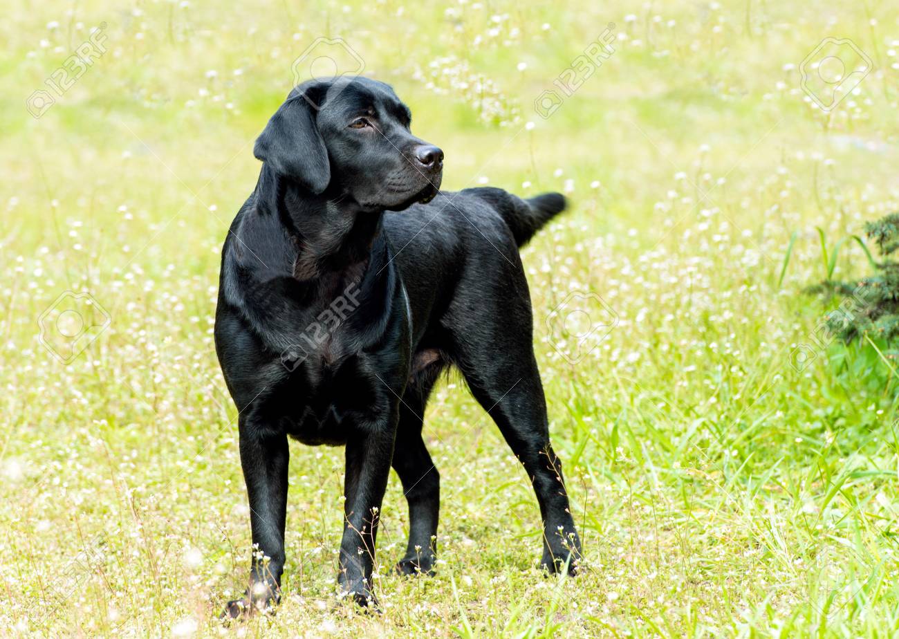Immagini Stock Il Cane E Un Labrador Retriever Nero Di Razza In Piedi Nella Posizione Dello Spettacolo In Mezzo A Prati Fioriti Image 57557559