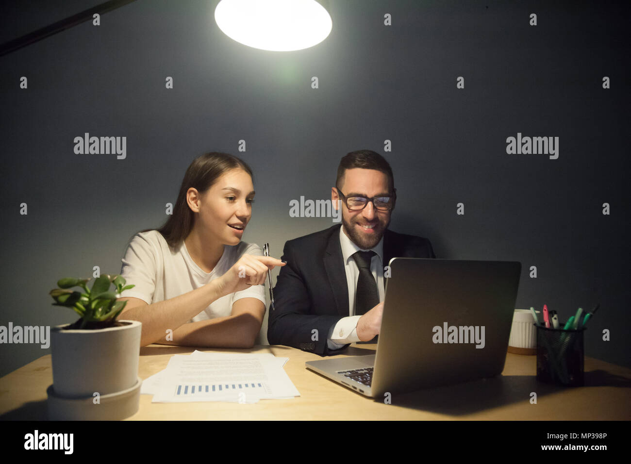 I Colleghi A Guardare Divertenti Video Nel Computer Portatile Durante La Pausa Di Lavoro Foto Stock Alamy