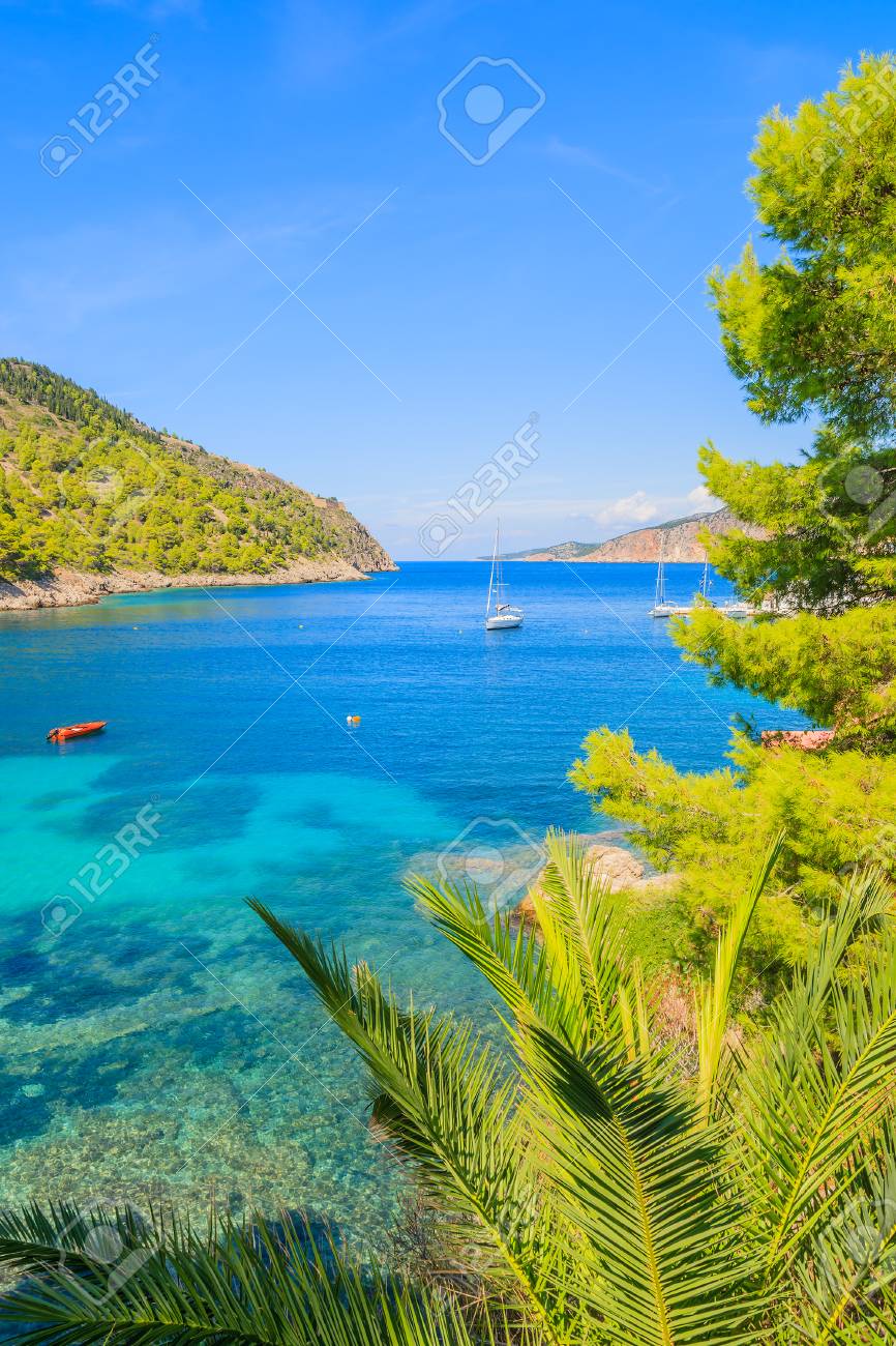 Immagini Stock Vista Di Belle Baia E Palme Del Mare Nella Citta Di Assos Isola Di Kefalonia Grecia Image 92759941
