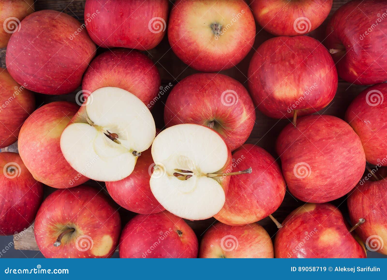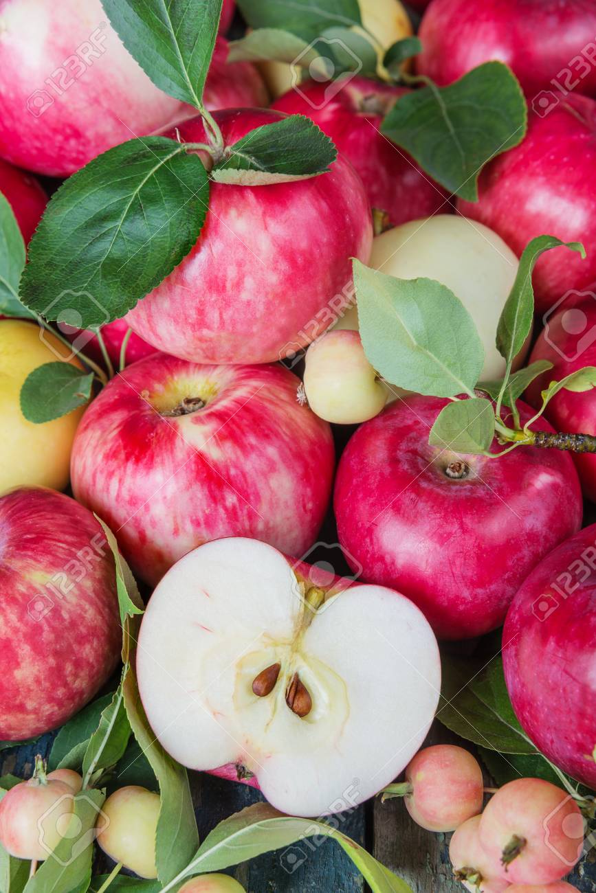 Immagini Stock Molte Mele Rosse Con Foglie Verdi E Meta Della Mela Sul Vecchio Tavolo Di Legno Image 45286076