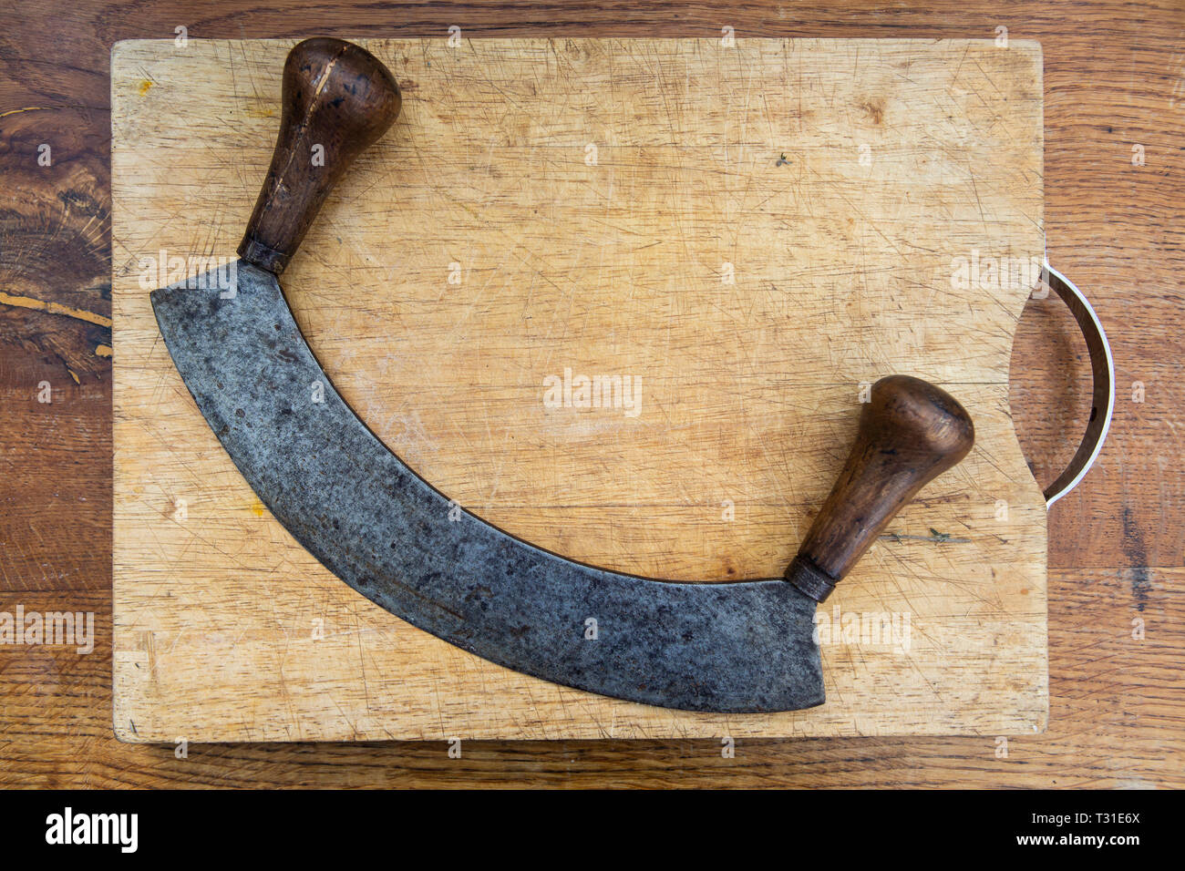 Mezzaluna And Wooden Chopping Board Stock Photo Alamy