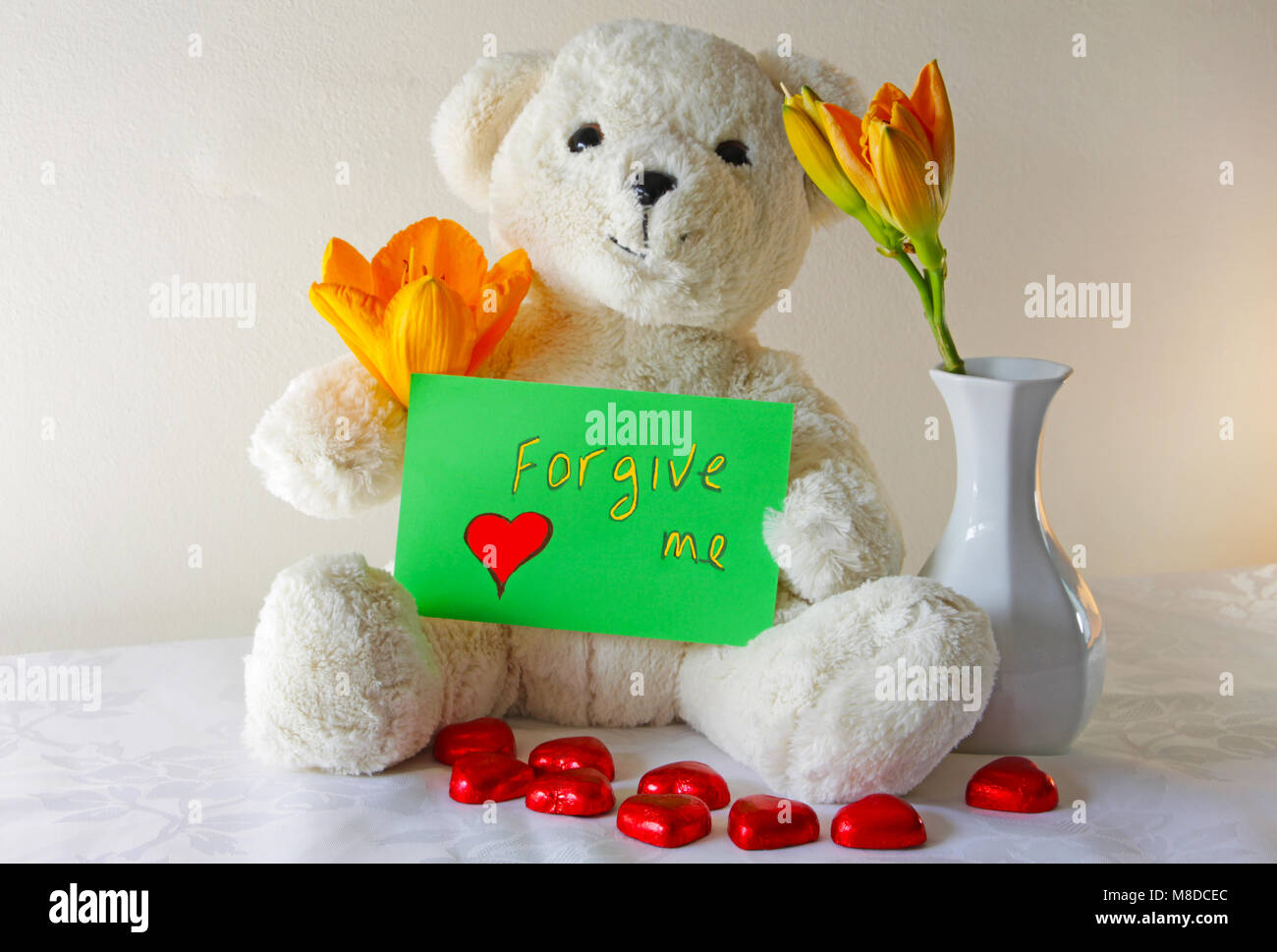 Simpatico Orsacchiotto Bianco Azienda Agreen Cartello Che Dice Che Mi Perdoni Foto Stock Alamy