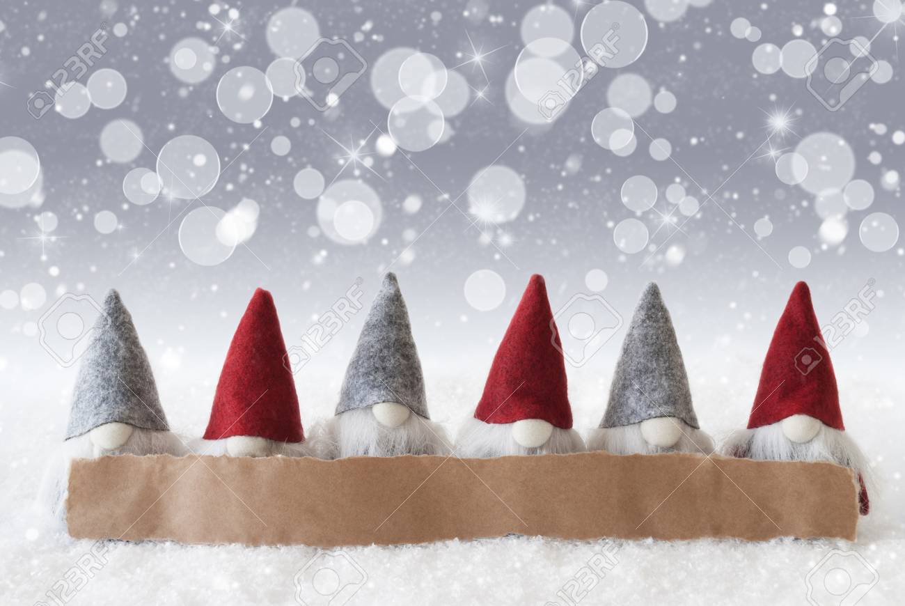 Immagini Stock Etichetta Con Copia Spazio Per Pubblicita Biglietto Di Auguri Di Natale Con Gli Gnomi Bokeh Scintillante E Sfondo Argento Con Neve Fiocchi Di Neve E Stelle Image 65145824