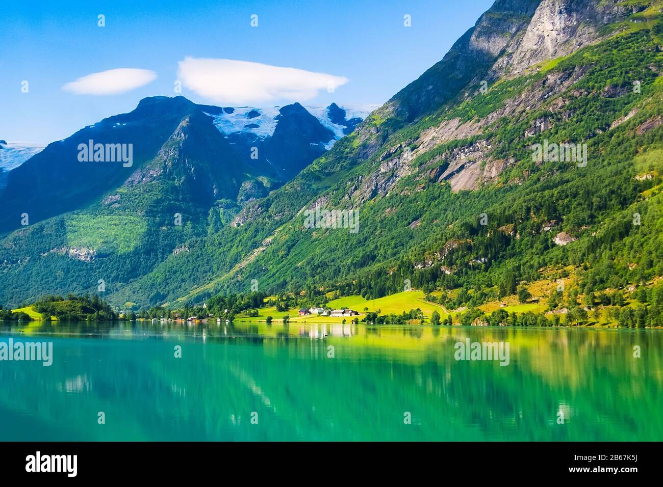 Paesaggio Norvegese Con Fiordo Del Nordfjord Montagne Case E Ghiacciaio A Olden Norvegia Foto Stock Alamy