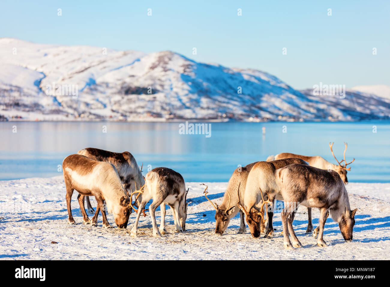 La Renna Nel Nord Della Norvegia Con Fiordi Mozzafiato Dei Paesaggi Sulla Soleggiata Giornata Invernale Foto Stock Alamy
