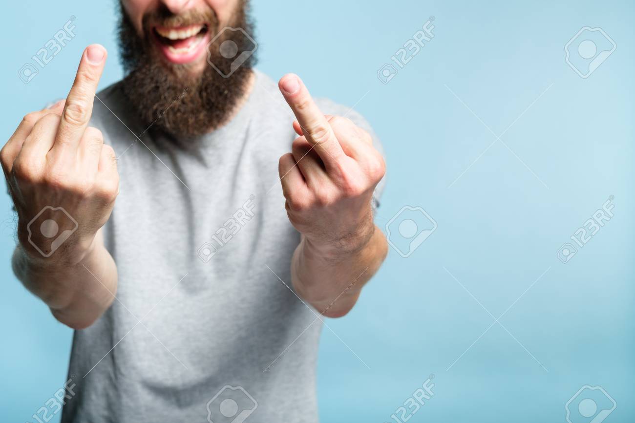 Immagini Stock Bearded Man Showing Middle Fingers Provocation Defiance Attitude And Offensive Indecent Behavior Concept Cropped Shot Of A Male Torso On Blue Background Casual Hipster In Grey T Shirt Image 108104003