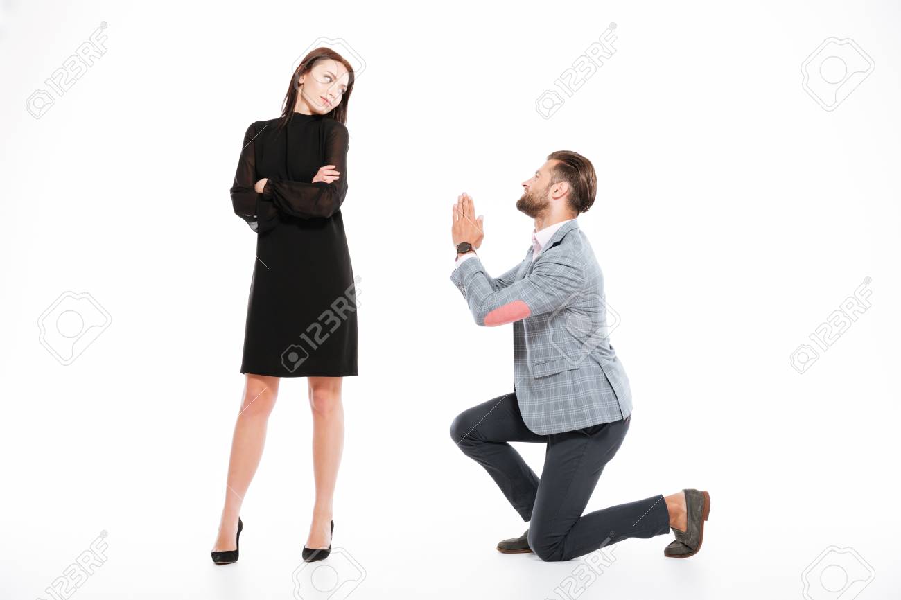 Immagini Stock Immagine Di Giovani Coppie Amorose Offensive Che Si Levano In Piedi Isolate Sopra Priorita Bassa Bianca Guardando Da Parte L Uomo Chiede Scusa Image 78517036