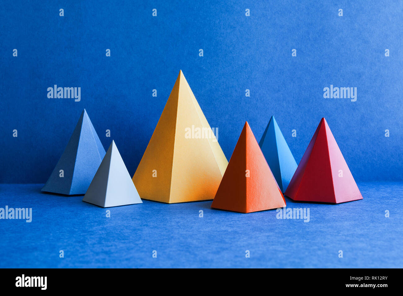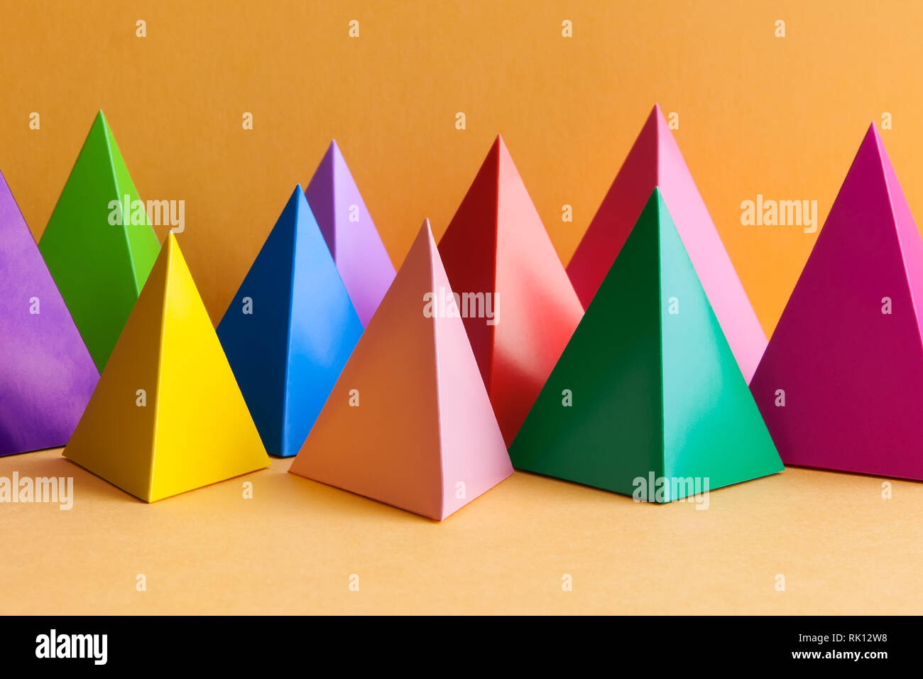 Immagini Stock Figure Geometriche Astratte Colorate Forme Di Prisma Tridimensionale Della Piramide Priorita Bassa Arancione Colore Rosa Rosso Giallo Verde Viola Oggetti Colorati Rossi Superficie Di Carta Testurizzata Copia Spazio Verticale