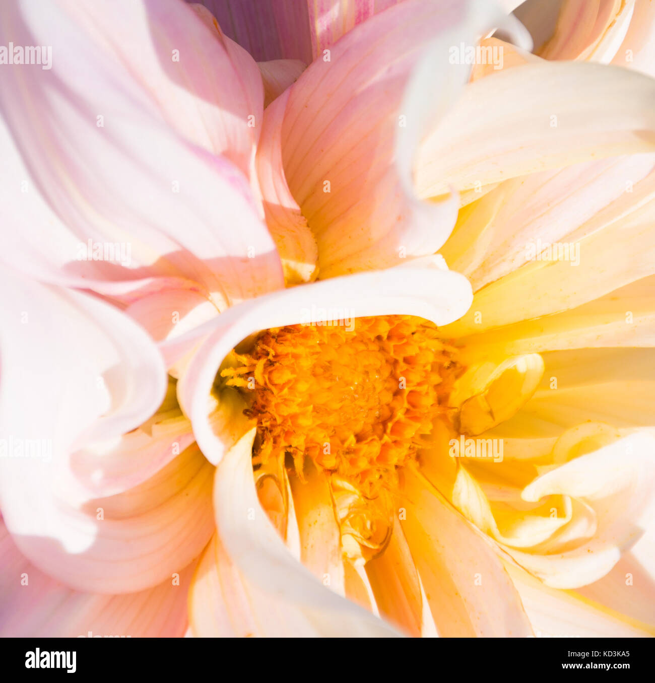 Close Up Piu Rosa E Bianco Petali Di Una Dalia Il Centro Del Fiore E Oro Profondita Di Campo Ridotta In Presenza Di Luce Solare Foto Stock Alamy