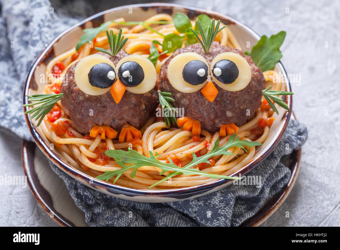 Pasta Spaghetti Con Polpette Divertente Per I Bambini Uccelli In Nidi Foto Stock Alamy