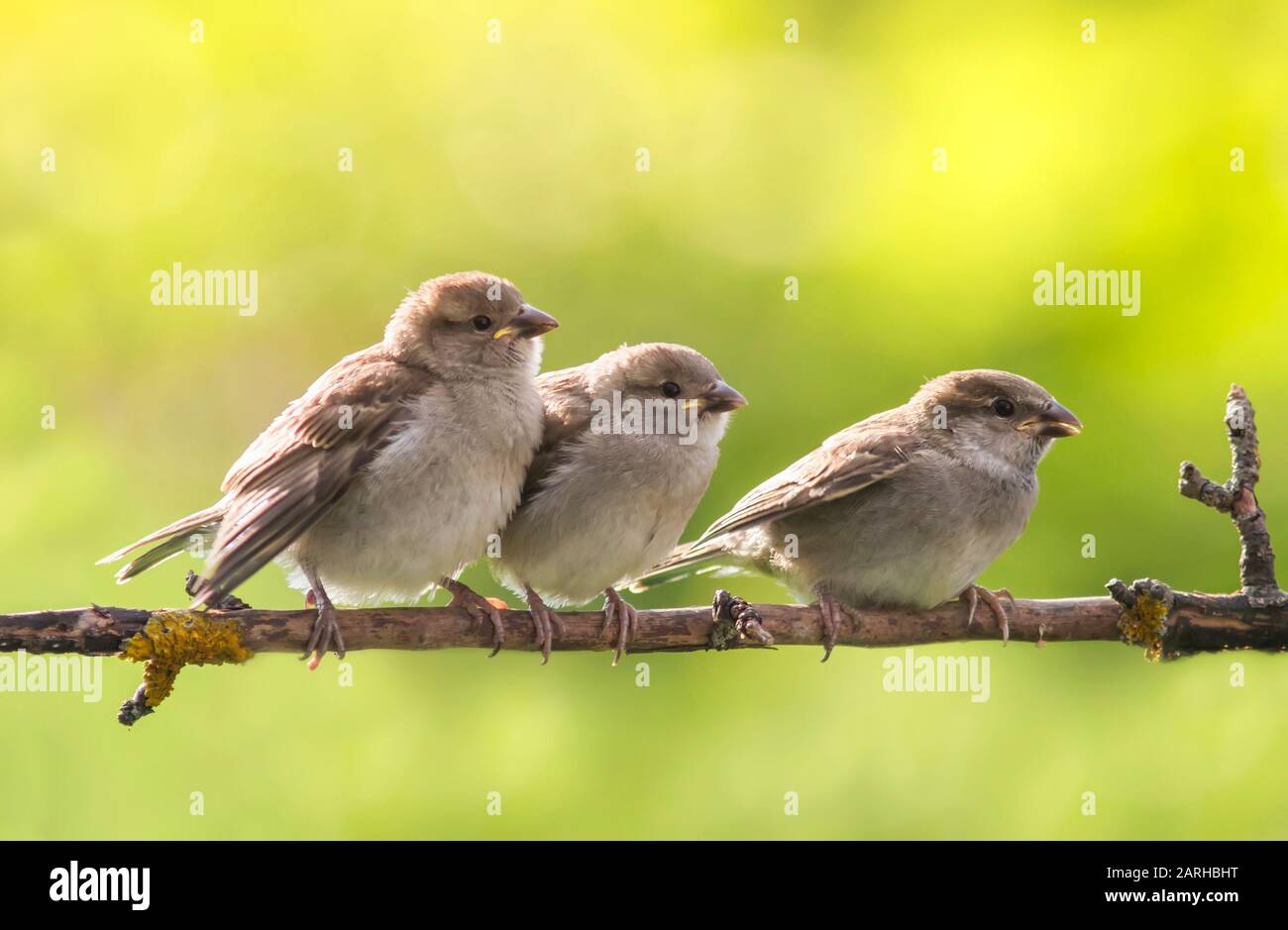 Tre Piccoli Divertenti Pulcini Di Sparrow Giallo Mouted Siedono Su Un Ramo In Un Giardino Soleggiato Estivo Foto Stock Alamy