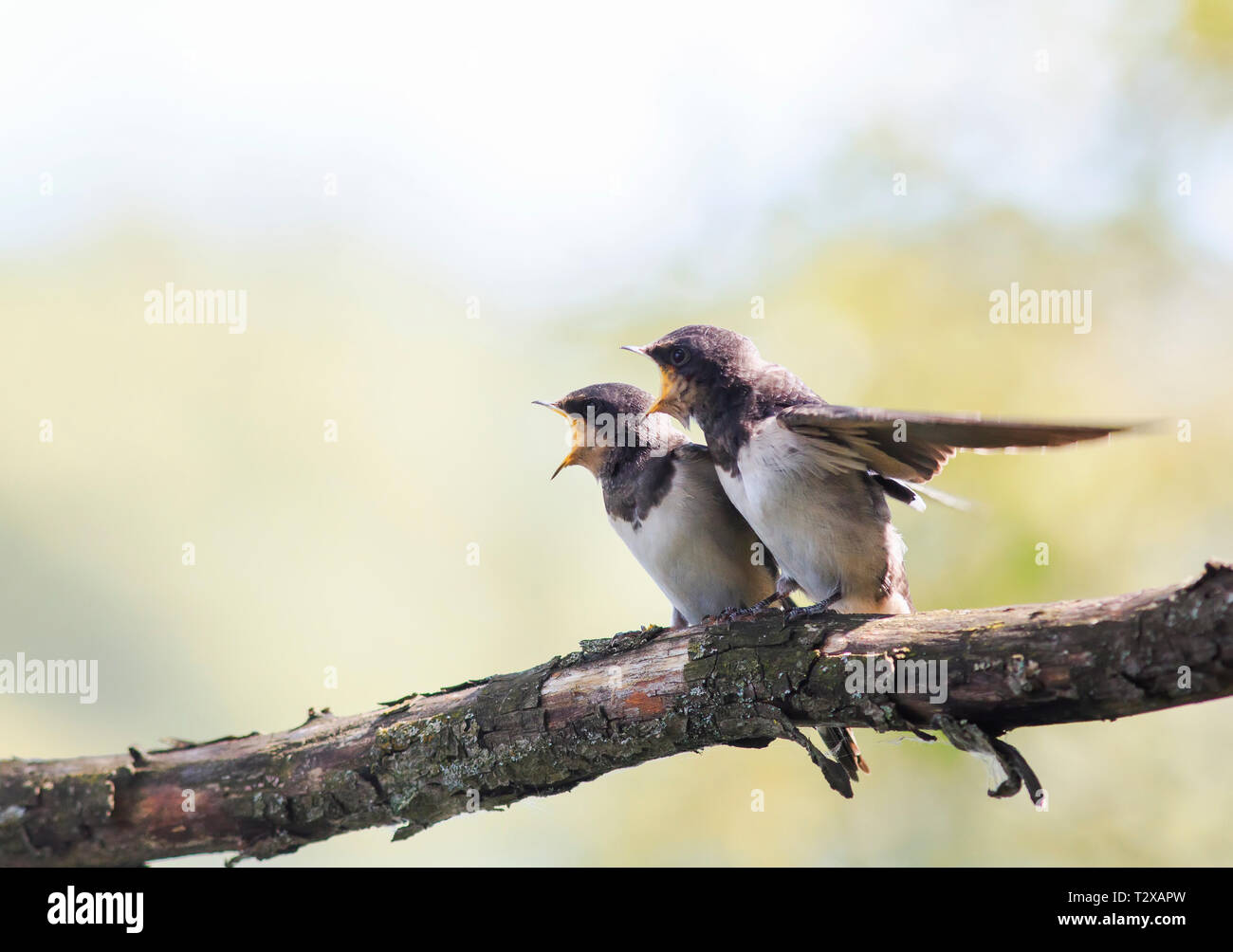 Due Piccoli Plump Divertenti Pulcini Del Villaggio Rondini Si Siedono Su Un Ramo E Attendere Che I Genitori Degli Uccelli Per Aprire I Loro Becchi Wide Open Foto Stock Alamy
