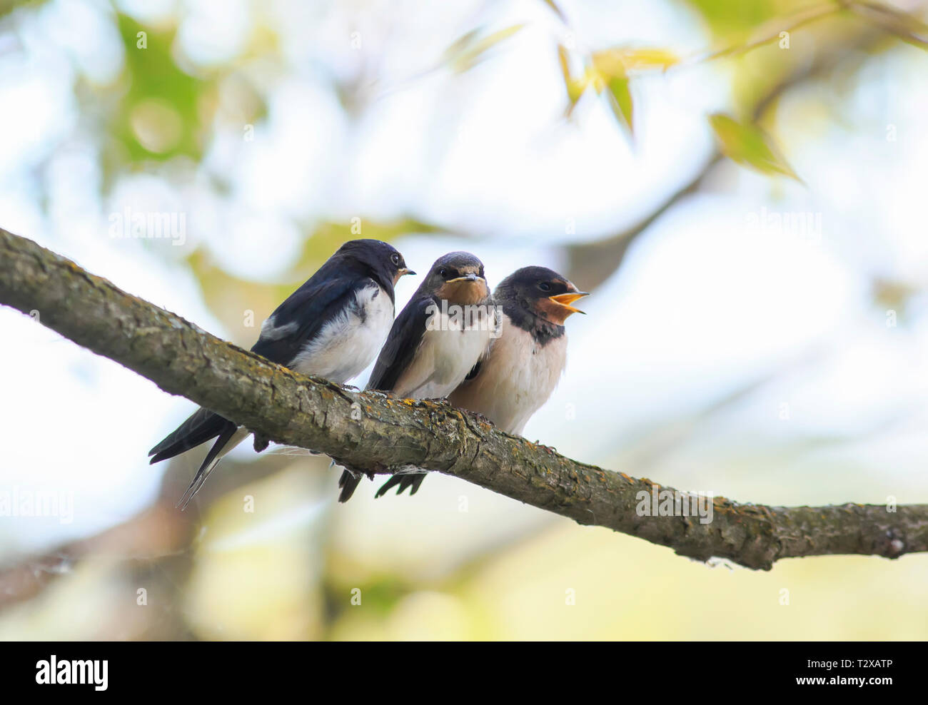 Tre Piccoli Plump Divertenti Pulcini Rondini Seduti Insieme Su Un Ramo In Attesa Per I Genitori Degli Uccelli Foto Stock Alamy