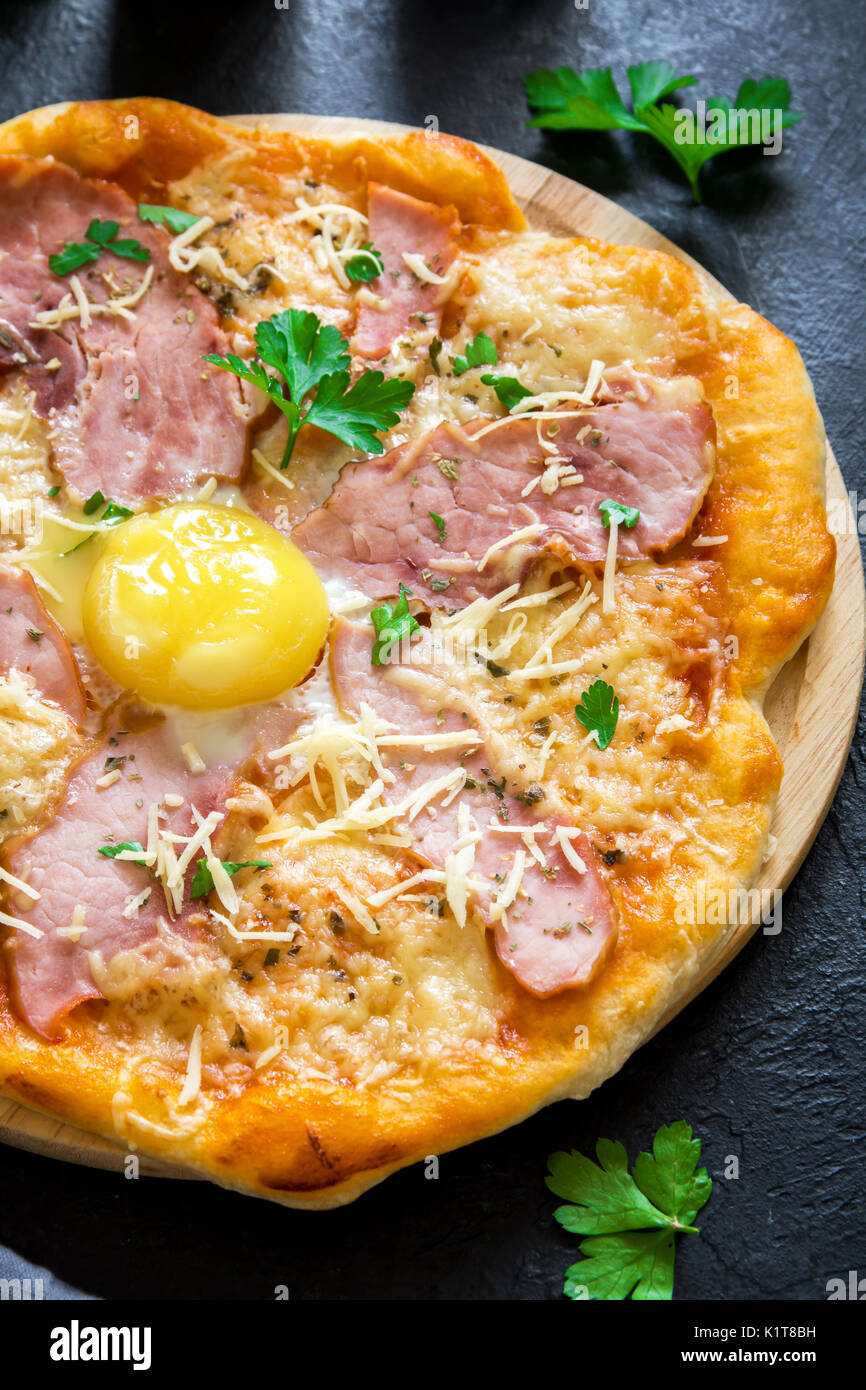 Pizza Carbonara On Black Stone Background Italian Pizza Carbonara Stock Photo Alamy