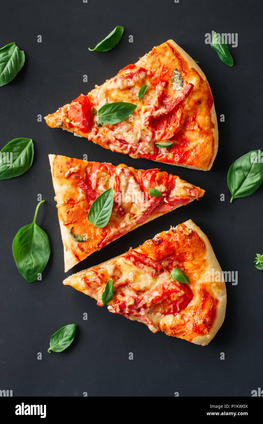 Three Slices Salami Mozarella Pizza Black Background Top View Flat Lay Copy Space Stock Photo Alamy