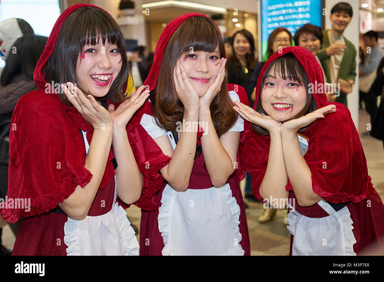 Tre Ragazze Giapponesi Vestiti Come Cappuccetto Rosso Alla Festa Di Halloween In Shibuya Tokyo Foto Stock Alamy