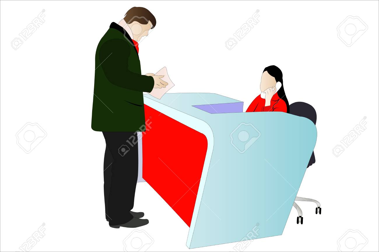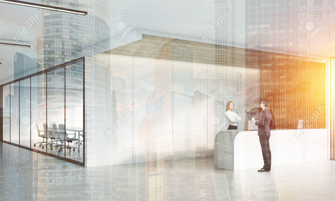 Immagini Stock Il Giovane E Vestito Sta Parlando Con Reception Bionda In Ufficio Con Sala Conferenze Immagine Tonica Rendering 3d L Esposizione Doppia Image 65054601